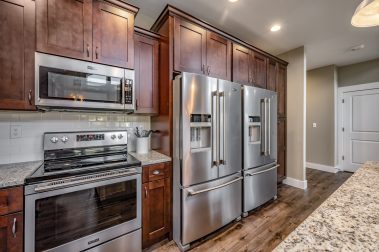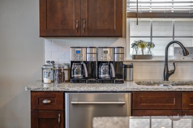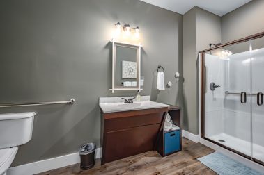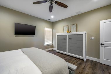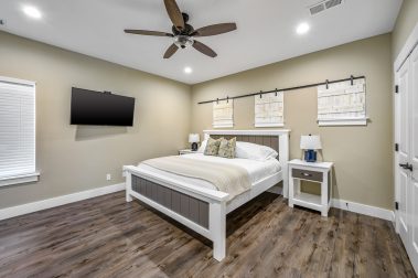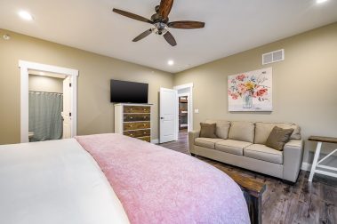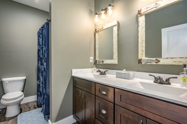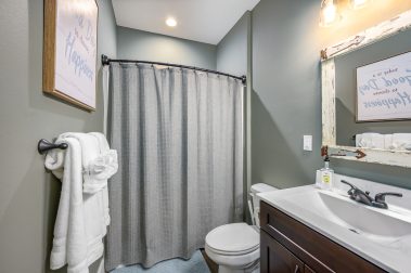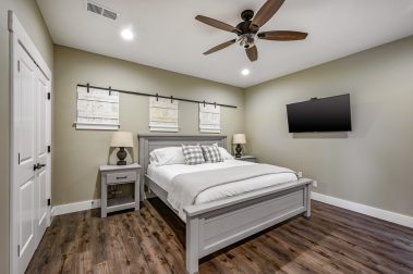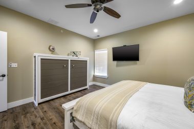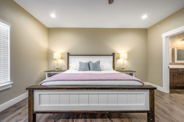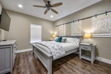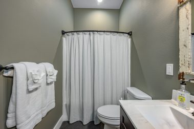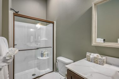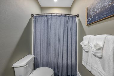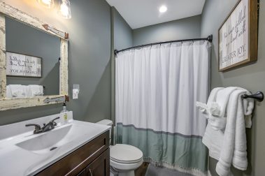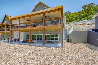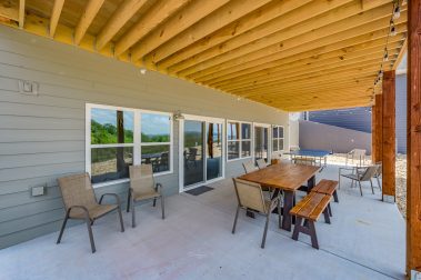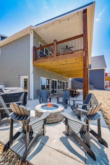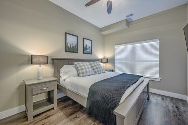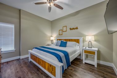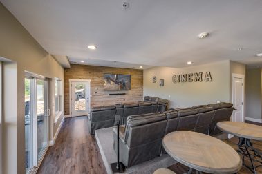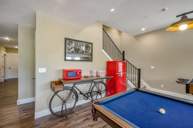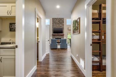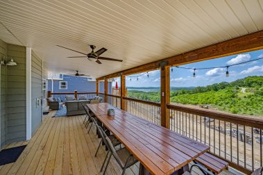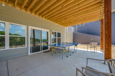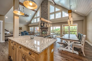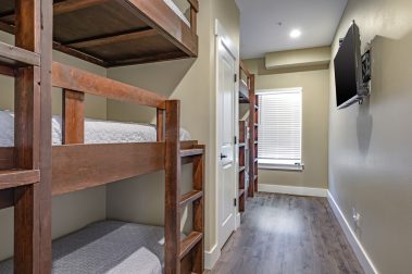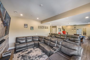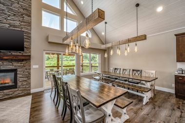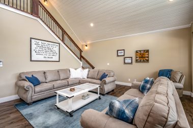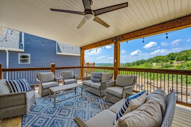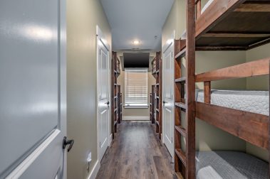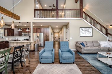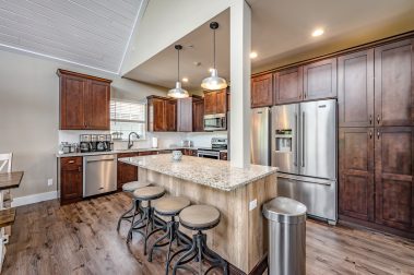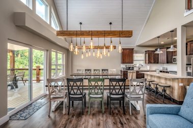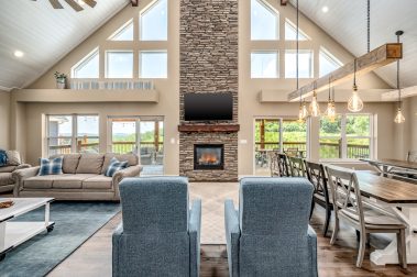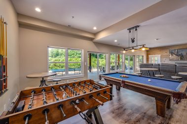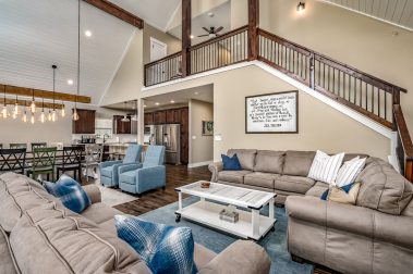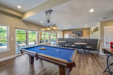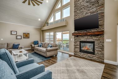 Chateau Retreat is perfect for many guests and provides seven king master suites, two bunk rooms, two outdoor fire features, pool table and media area with 86″ TV and power-reclining seating. The covered deck and patio add over 1000 sq. ft. of additional gathering space.